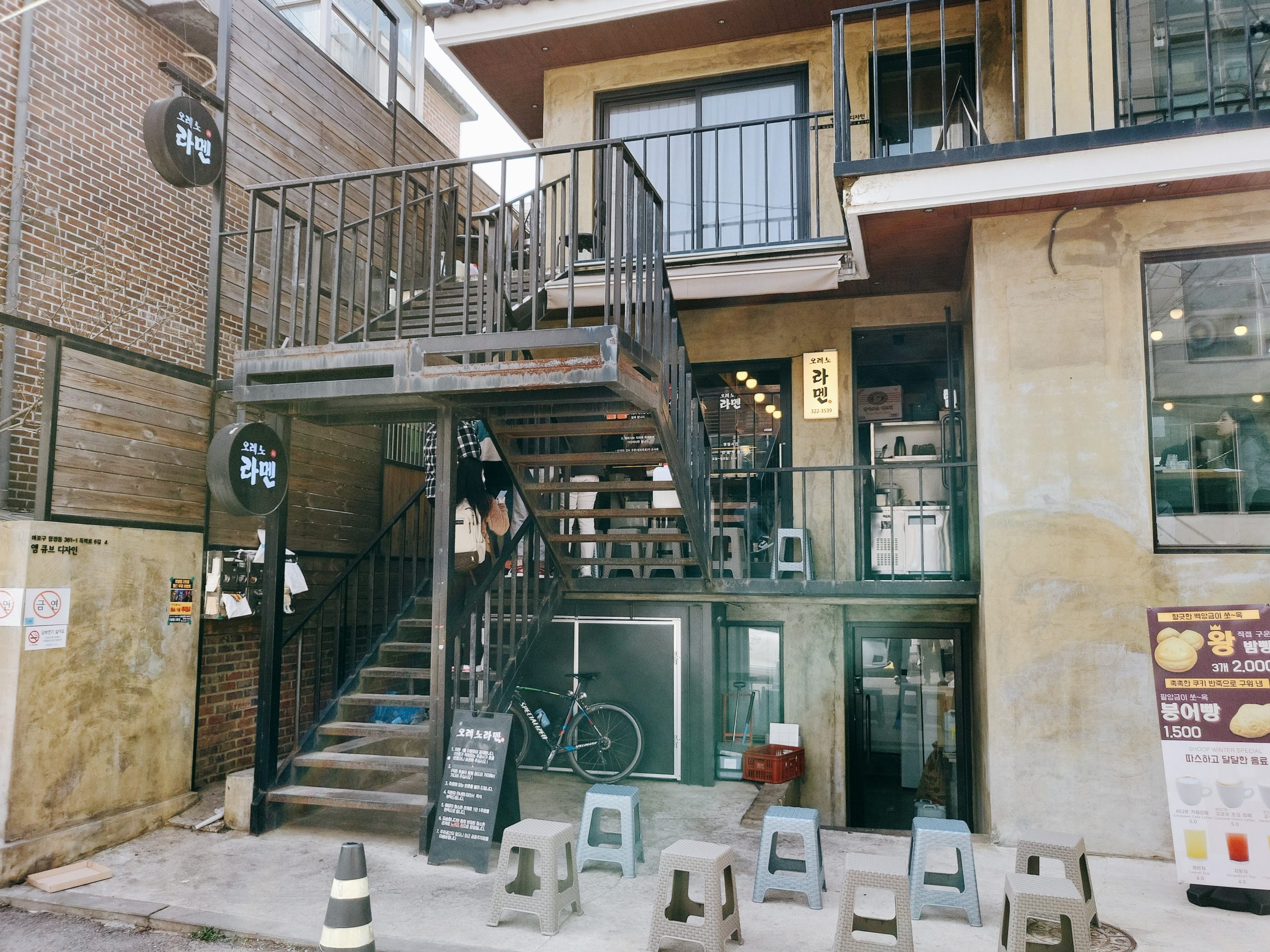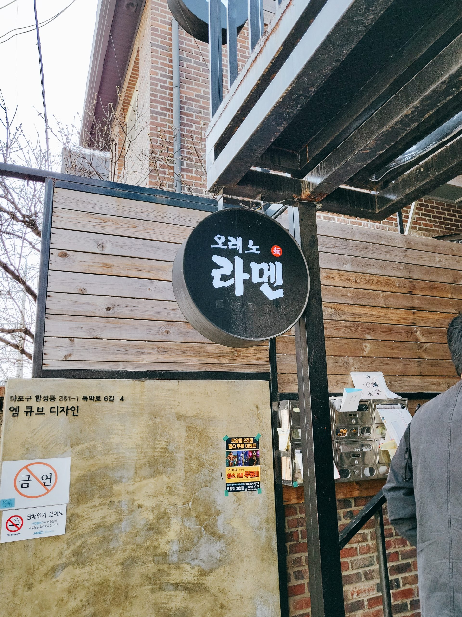 합정역에 위치한 오레노라멘 본점을 가면 살짝 낡아보이는 건물의 이층에 다음과 같이 오레노라멘 간판과 입구를 발견하실 수 있습니다.