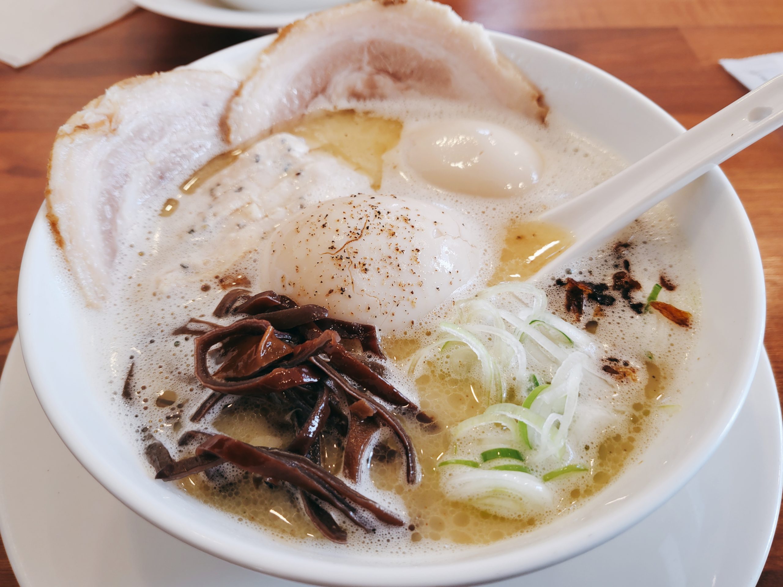진한 닭 육수 국물에 닭고기, 계란까지 얹어져 있는 토핑은 전체적으로 흰 분위기를 자아내 내가 알던 라멘과 다른 느낌입니다. 송송 썰려 얹어져 있는 파와 목이 버섯은 너무 무거울 수 있는 맛의 밸런스를 잡아줍니다.