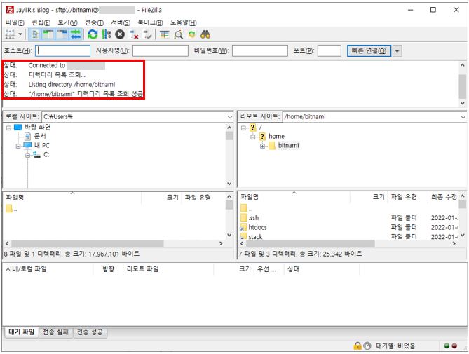 FileZilla로 서버에 접속하면 왼쪽에는 로컬 PC의 디렉토리, 오른쪽에는 원격 서버의 디렉토리가 조회되며, 사용자가 원하는 파일을 선택해 올리거나 내려받을 수 있습니다.